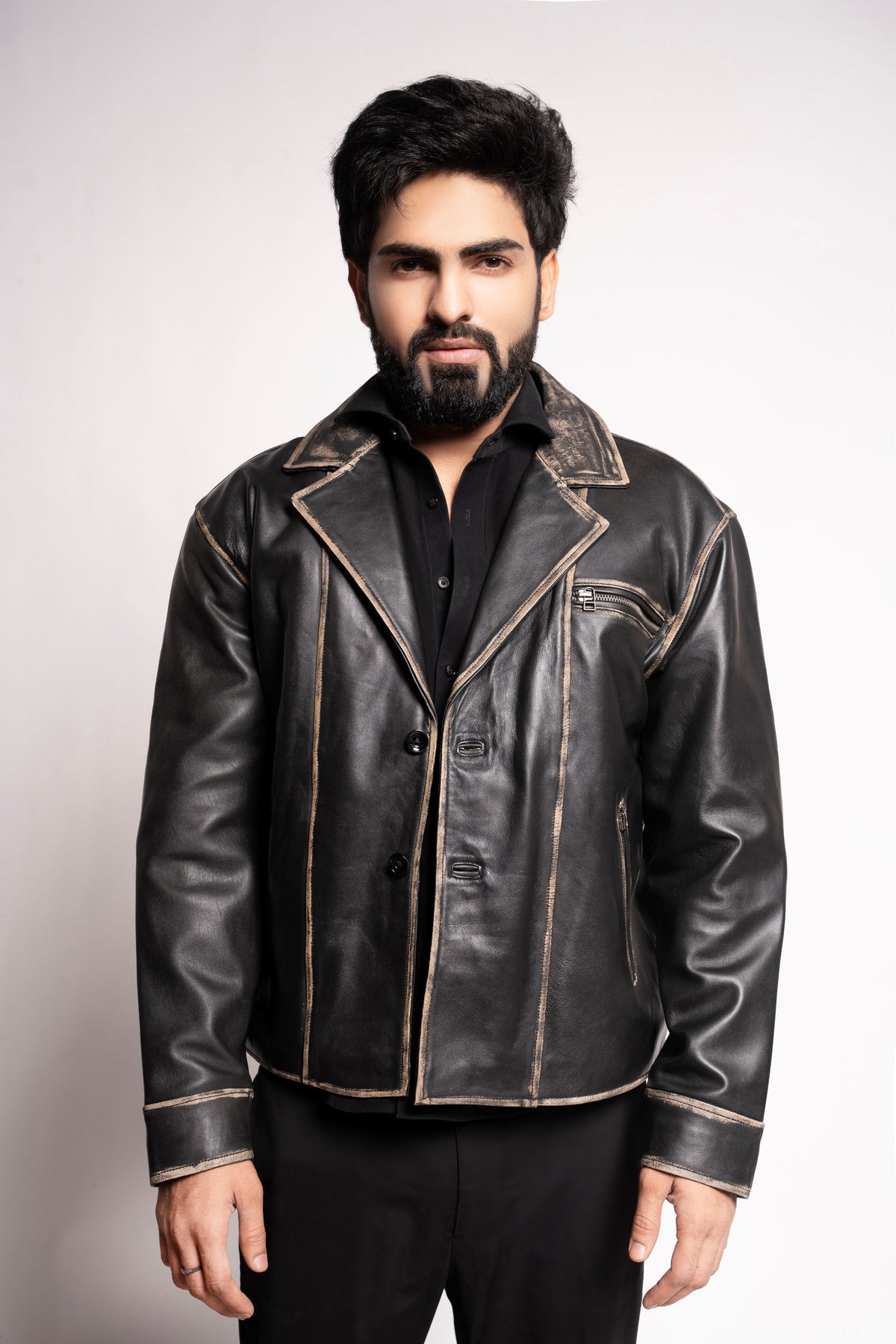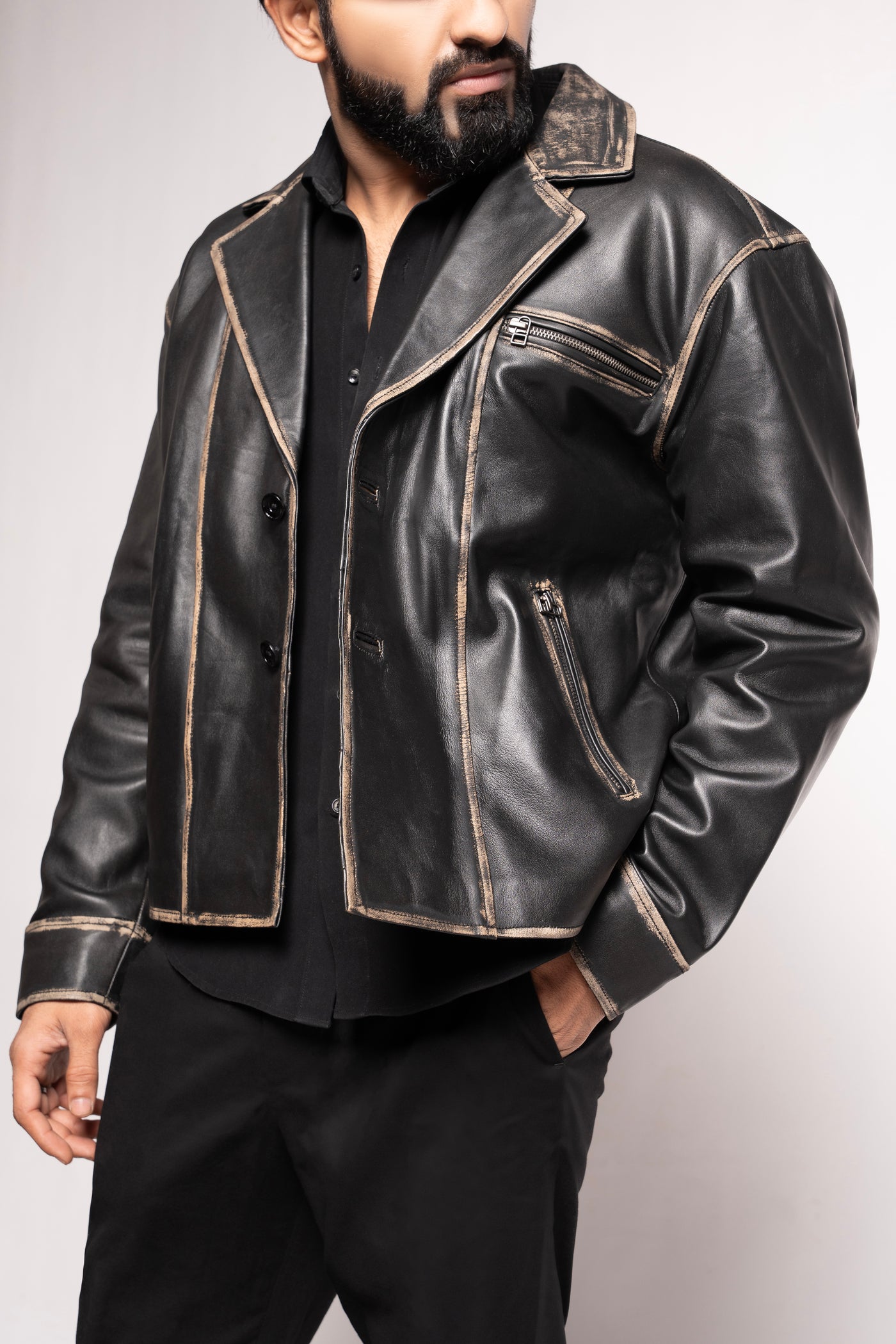 Combining the sharp silhouette of a tailored blazer with the raw energy of a biker jacket, this piece features a bold notched lapel and a secure three-button closure. The architectural paneling and reinforced stitching provide a structured, masculine fit, while the subtle metallic zippers add a touch of modern utility. This is more than just outerwear; it’s a statement of grit, style, and uncompromising individuality.